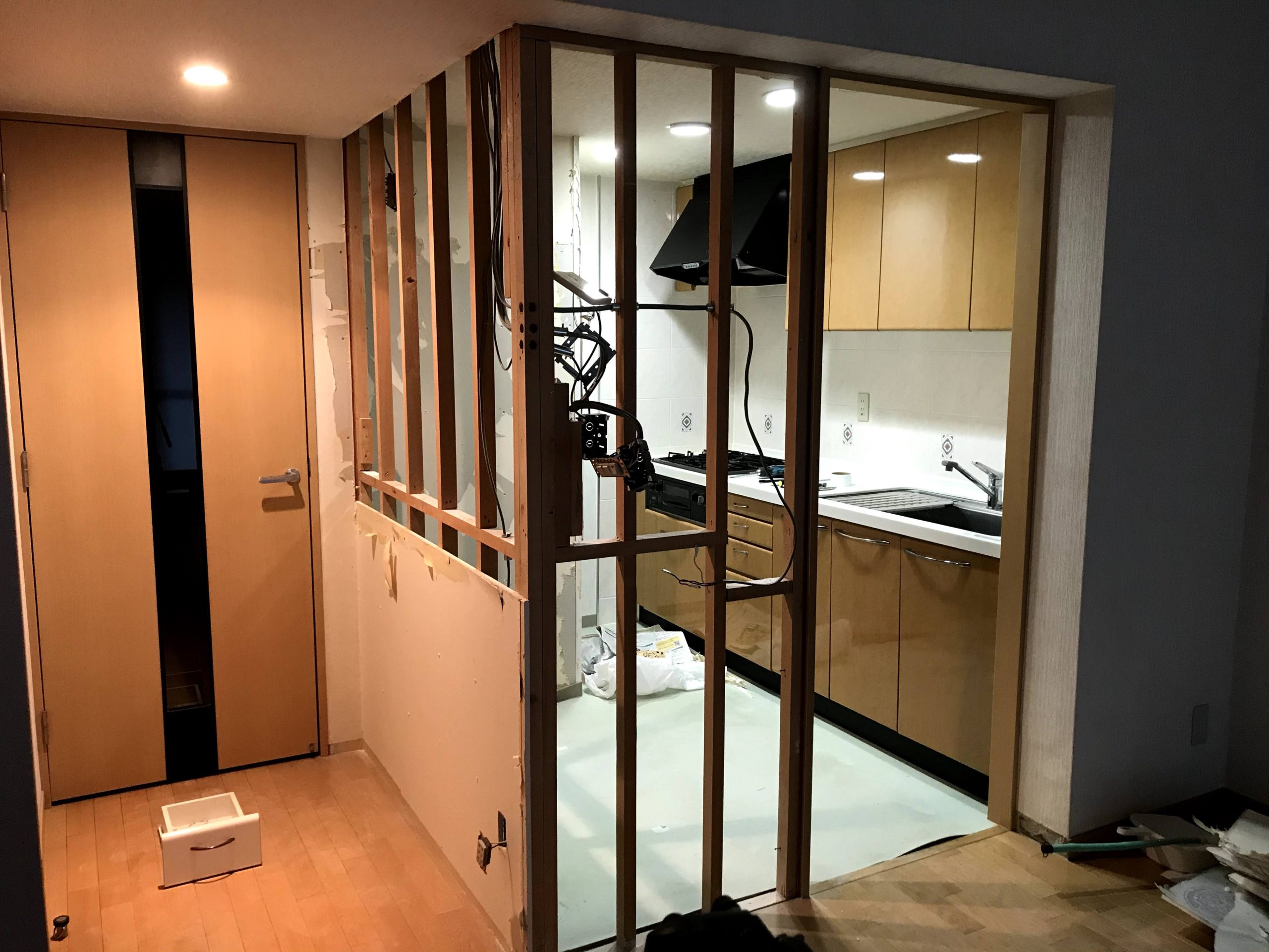 まずはキッチンを対面式にするためにキッチン周りの壁の撤去から始めることにした。