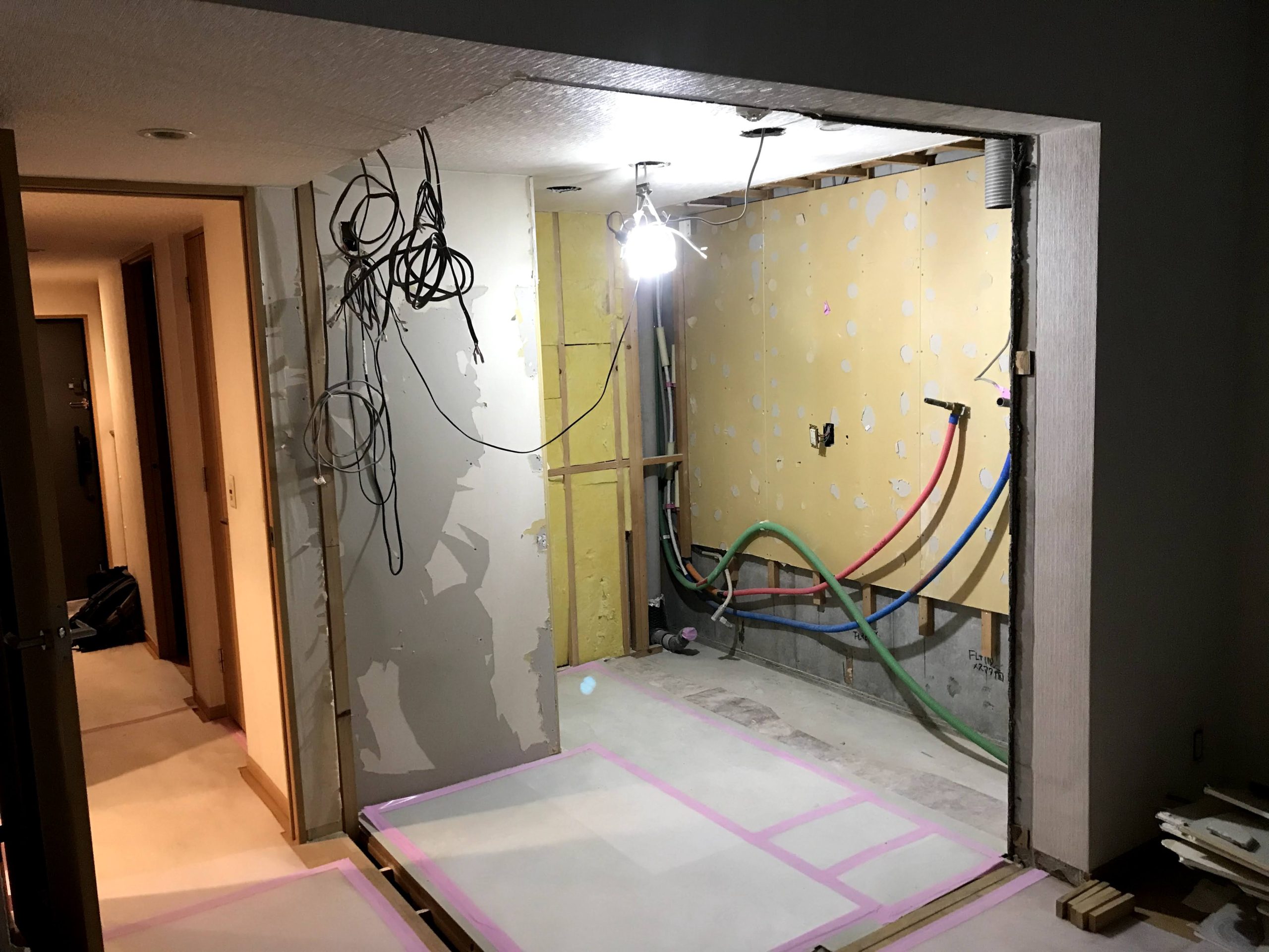 浴槽のパーツが和室にどんどん運ばれて来たので、自分の作業スペースもなくなり、先にキッチンの壁を破壊することにした。業者さんは早々と昼休みだけど、自分は居残りで作業を進め、結局、夕方まで、飲まず食わずになってしまった。久しぶりに夢中になった!